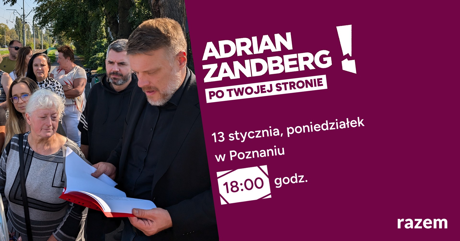 Zandberg w Poznaniu: przegranymi wojny polsko-polskiej są ludzie.W poniedziałek 13 stycznia Adrian Zandberg — kandydat Partii Razem w nadchodzących wyborach prezydenckich wyruszył w trasę po kraju. Podczas wizyty w Poznaniu polityk spotkał się z zagrożonymi wysiedleniem mieszkańcami Osiedla Maltańskiego.Czytaj więcej